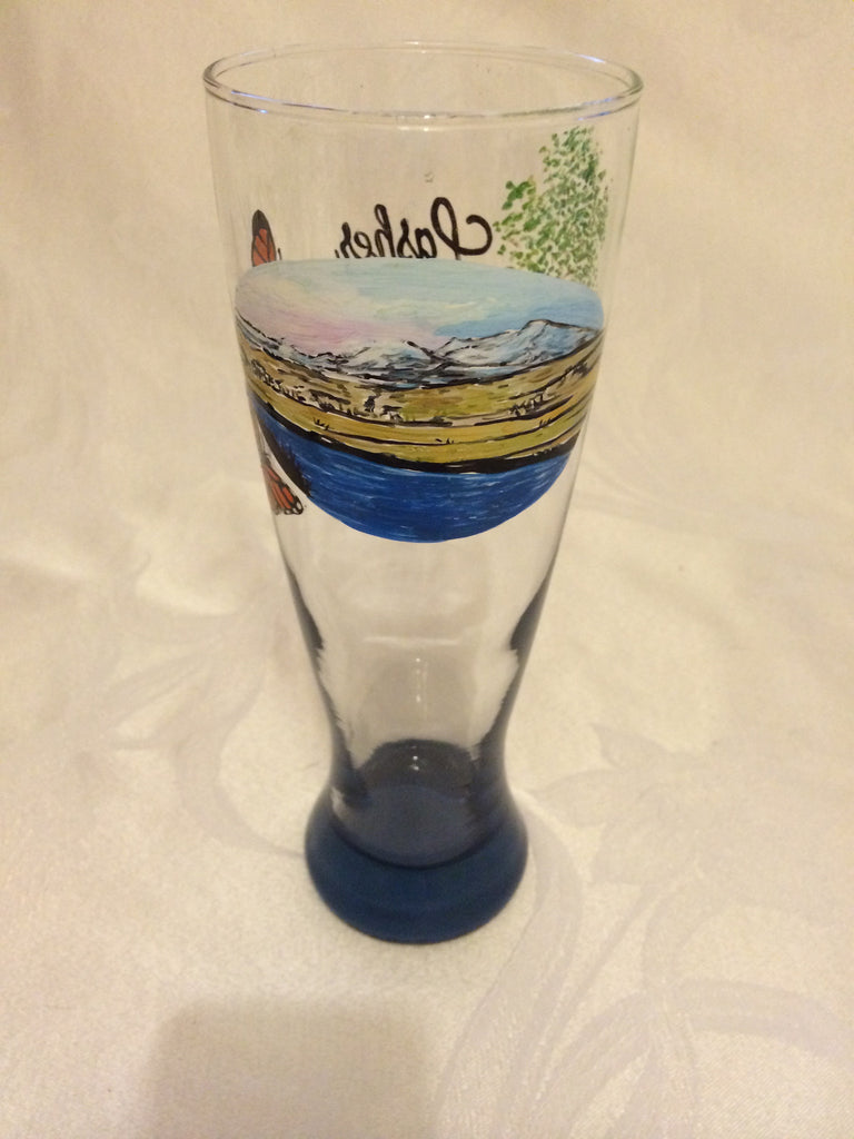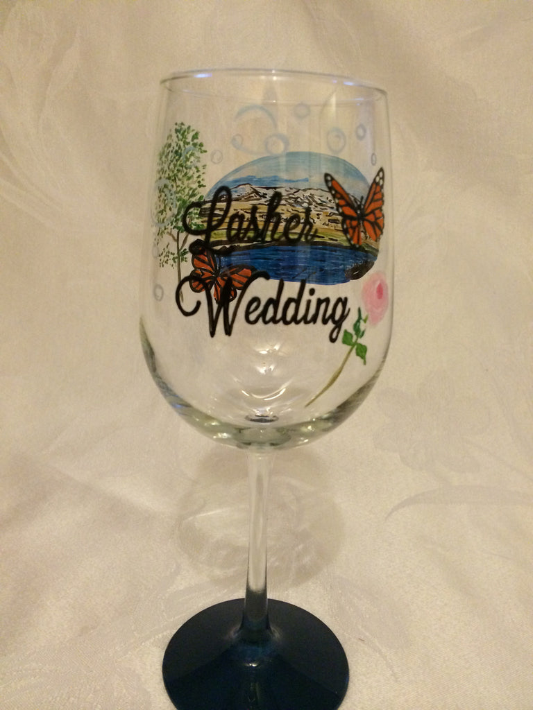 The wedding took place in the mountains of MT near a river and a grove of Cotton Wood. Hannah requested several design elements to be painted on a variety of glasses to give as favors for her bridal party and special guests.